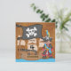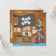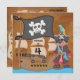Ahoy matey! A skull and crossbones flag flies in the breeze near the big pirate ship as the dark haired, medium skin captain stands by dressed in pirate gear complete with eye patch and a parrot! The back of these colourful pirate invitations features a treasure map and areas that you can easily add all your pirate birthday party specifics!