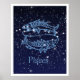Poster featuring the symbol for Pisces in soft silver blue, overlaid with the stars of the constellation, against a starry sky background graded from deep midnight blue to black.