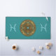 This mandala was designed for the zodiac sign, Pisces, depicting an aquamarine stone in the centre surrounded by elements representing the sign, such as the symbol for the sign, the constellation, and the alchemical symbol for Water, as well as filigree vines and weaves wrapping it all into a solid image in shades of aqua, brown, and bronze.