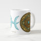 This Pisces themed mandala features an aquamarine stone surrounded by the symbol for the sign, the constellation, and the alchemical symbol for Water among filigree and weaves. This mug is available in jumbo, espresso, and bone china sizes and styles.