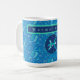 Pisces zodiac astrology sea blue mug shows off a cool, modern pattern for an ancient constellation. The symbolic fish pair, aqua and green, swim amid the stars and black holes of the sea blue background. The golden glyph of Pisces original ruler, Jupiter and the iridescent colored Pisces glyph add depth and excitement. Use my whimsical "mermaid fuel" title or personalize for your pisces.