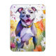 A digital art image of a pit bull dog with its tongue out stands amidst vibrant flowers and a colourful abstract background. Bright splashes of colour and whimsical details create a lively scene.
