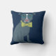 This throw pillow features an illustration of a handsome pup. This dapper dog is wearing a pair of teal coloured glasses and a lime green bow tie and set against a navy blue background.