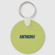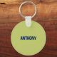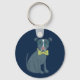 This custom keychain features an illustration of a handsome pup. This dapper dog is wearing a pair of teal coloured glasses and a lime green bow tie and is set against a navy blue background. On the reverse side is a spot to add a name in navy blue letters against a lime green background.