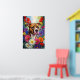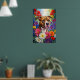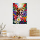 A brown and white pitbull dog with a serious expression is depicted in a vibrant flower garden. The dog's head and shoulders are the focal point, surrounded by a profusion of colourful blooms. The flowers are a mix of red poppies, yellow daisies, and various shades of pink, purple, and blue. The background is a soft, blurred watercolor wash of blue and green, suggesting a sunny day. Ideal for pit bull lovers.