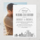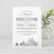It features a modern deco-style illustration of the city's skyline resting towards the bottom. Centred above this are the names of the wedding couple and your wedding day information in matching open-lined style text. The text elements of this are framed by a square line border enveloping it. This is all together presented in a neutral black and white, classic colour theme.