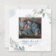 PixDezines thank you and Birth Announcement for a baby boy with watercolor foliage in dusty blue Eucalyptus, and champagne bubbles.