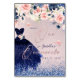 PixDezines quinceanera table number, featuring glitter watercolor flowers in blush and navy blue, a glittering gown in navy blue, blush and silver butterflies and iridescent background (see filters to change tone). All elements are editable.
