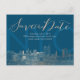 PixDezines save the date with sketched NYC cityscape with Twin Towers in faux silver and, of course, our background in dark teal is also DIY.