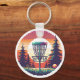 An ai illustration of a disc golf course with basket, pine trees and sunset in an 8-bit pixel art gaming vibes style.