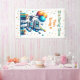 Personalised Birthday banner with a robot theme. Cute pixel art robot, to give it a gaming vibe, in orange and teal blue, holding balloons and gifts. Cute for any little boy.