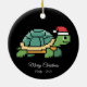 Slow and steady wins the race to holiday cheer with this charming Pixel Art Turtle/Tortoise Santa Hat Ceramic Ornament! Featuring a cute green reptile with a large shell, designed in a fun retro 8-bit style, this charming creature is topped with a festive Santa cap and is set against a sleek black background for a modern, bold look. It's the perfect Christmas gift for turtle owners, reptile lovers, fans of ocean or garden animals, and anyone who appreciates unique, stylish pixel art. This high-quality ceramic circle ornament is fully customizable—easily add a name and year (like 'Merry Christmas Emily - 2025') to create a treasured, one-of-a-kind personalized keepsake for your tree.