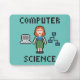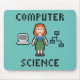 Pixel art illustration depicting a female computer scientist, a computer and a fluxogram.