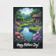 This card shows a pixel-style garden scene with a gently curving stream in deep blue, catching tiny light flecks as it winds through bright green grass edged with small grey stones. Along both banks, dense flowers in pink, purple, and white cluster together, and the way they lean towards the water feels like a quiet, caring gesture ❤️. In the midground, an open-sided shelter with a warm brown tiled roof and simple wooden posts sits near the stream, like a calm spot where someone might pause and share a soft smile 👩. Across the water, an aged stone wall runs behind the plants, partly covered in rich green ivy that drapes down in layered patches. The sky is pale blue with puffy, pixelated white clouds, and the overall lighting suggests a clear, gentle daytime glow. The message “Happy Mother’s Day!” appears in white lettering near the bottom, standing out against the darker framing border and the greenery behind it. Dark borders surround the scene, and the stream’s blue path leads the eye towards the little shelter and the ivy-covered wall.