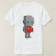 A cute metallic robot with a boxy head and glowing blue eyes, gently holding a bright red pixel-style heart. The smooth gray surfaces contrast beautifully with the vibrant heart glow, creating a warm emotional focus. Clean lines, subtle textures, and a soft cartoon style give this illustration a charming balance between futuristic and adorable, expressing innocence, warmth, and digital love.