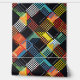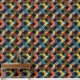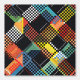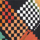 This artwork features a dynamic and colourful patchwork pattern composed of pixelated, chequerboard-like squares and rectangles. The design is a vibrant mix of colours including reds, yellows, blues, and greens, set against a stark black background. The pixelated elements overlap and intersect, creating a sense of depth and movement within the composition. The combination of geometric forms and bright colours, along with the digital pixelation effect, gives the artwork a modern, tech-inspired aesthetic while also resembling a traditional quilt pattern.