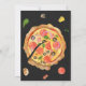 Cute invitation for young chef's birthday party featuring big slice of pizza, red and green garland and pizza circle at the bottom.