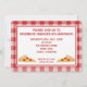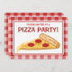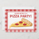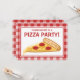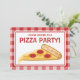 This fun pizza birthday party invitation card template features a cool cartoon illustration of a greasy slice of pizza with three pieces of salami and a lot of cheese on top of it. The background colour is red with a classic gingham plaid pattern.