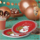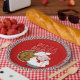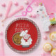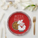 Pizza Party-is a digital graphic art design. Chef Italiano stands at the lower right corner. A pepperoni pizza on the pan sits just off to the left. Decorative red and white text reads: PIZZA PARTY. The centre background is red. The plate border is an allover background checks pattern on angle of white, red and black squares. The inner rim is black and the outer rim is red. This design is available with assorted background and border colours. Coordinating invitations and party supplies is available.