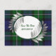 Elegant wedding save the date post card done in the traditional Forbes green and blue tartan plaid. Lovely graphics of silver tone fern fronds frame a round white text area, on the front. All text, on the front and back side of the card, is fully customisable to read what you want.