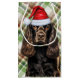 Adorable holiday gift bag for the dog lover who has a fondness of the Chocolate Cocker Spaniel dog breed with a cute Cocker in a red Santa hat on a great seasonal green plaid patterned background.