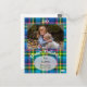 Holiday photo post card with Grey plaid background image. Design by HAMbyWhiteGlove. Blue, yellow, pink.