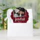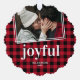 Classic christmas holiday ornament card featuring a family photo with a white contemporary 2 border design, a red & black plaid backdrop, the beautiful word "joyful" in a elegant font, your names, and year.