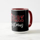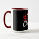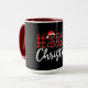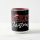 The word “MERRY” bursts across a black background in bold red and black plaid lettering, with a playful Santa hat perched atop the letter “E.” Beneath it, “Christmas” appears in elegant white cursive, adding a touch of seasonal warmth. The red interior of the mug enhances the festive contrast, making the design pop with holiday energy. This cheerful layout blends rustic charm with whimsical flair, perfect for celebrating the joy and tradition of Christmas in a bold, personalized way.