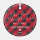 Mr & Mrs. christmas ornament featuring a traditional red plaid background, the saying 'our first christmas as' in an elegant white script font, your titles, married name, and the year.
