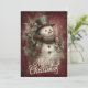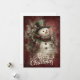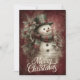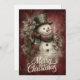 Share classic holiday cheer with this festive Christmas card featuring a joyful snowman dressed in a green top hat with a red band and a cozy red-and-green plaid scarf. Surrounded by holly leaves and berries against a rich red textured background, the snowman beams with seasonal spirit. Elegant white cursive lettering spells out “Merry Christmas,” making this card perfect for sending warmth, tradition, and timeless charm.