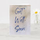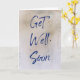 This get well card features bold blue handwriting style lettering that spells out the message "Get Well Soon" on the front against a textured tan coloured background. Blue lettering on the inside of this card is ready to be customised with your own special message.