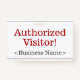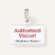 This plain badge design features the message "Authorised Visitor!", and a customisable company name or other custom message. It also features a double-line border. A badge like this could maybe be used to show that somebody at a business or workplace is an authorised guest or visitor. [~Z0000307]