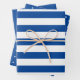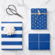 This set of wrapping paper sheets features a solid plain blue coloured sheet with coordinating sheets of wide plain blue stripes on white, and white polka dots on plain blue.