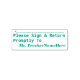This simple rubber stamp design features the message "Please Sign & Return Promptly To", in addition to a line for a signature or initials to be written above. It also features a customised educator name. It could be be used by a tutor, teacher or educator to ask a student’s parent(s) or guardian(s) to review and acknowledge the grade that a student got on a test, an exam, a project, a quiz, or some other school assignment.
