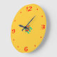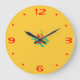 A plain bright yellow round kitchen clock,with red numerals and small aqua red design in centre .Customise to change size or change to square.