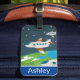Colourful planes flying above the Earth cartoon art on personalised luggage tag for kids.