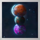 This image depicts a surreal scene of four planets stacked on top of each other in a cosmic dance. The planets are adorned with vibrant colours and intricate patterns, creating a mesmerising spectacle against the backdrop of a starry night sky. The artwork evokes a sense of wonder and mystery, inviting viewers to contemplate the vastness and beauty of the universe.