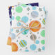 Wrapping paper with a First Trip Around The Sun theme for a 1st birthday party. These coordinate with the other outer space themed decor for celestial galaxy parties. These sheets have a blue planets and sun theme with assorted colours backgrounds. There are additional background colours available in this collection.
