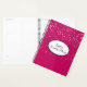 This planner notebook is shown with a petite silver-grey stars print on a bright Magenta background. Personalised name for you to customise to yours inside a White oval with dual coordinating coloured borders of black and cornflower blue on the front. Back same colour and stars print. Text is shown in Black.