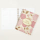 This planner notebook is shown with blush pink looking coloured roses floral print on a ivory background and brown leaves. Personalised name for you to customise to yours inside an ivory oval with dual coordinating coloured borders of golden and pink on the front. Back same colour and rose floral print. Text is in golden. Select your binder spiral on the side, this one is shown with gold.