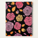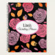 This planner notebook is shown with a rose floral print in bright pinks on a black background. Personalised name for you to customise to yours inside a white oval with dual pink borders on the front. Back same colour and floral print.
