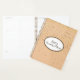 This planner notebook is shown with a petite Champagne and Chocolate stars mix print on a Peach background. Personalised name for you to customise to yours inside a white oval with dual coordinating coloured borders on the front. Back same colour and stars print. Item is Peach and Chocolate Brown colours.