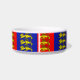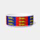 This is a heavy, durable bowl decorated with Tibbies of many colors, the perfect size for hungry/thirsty Tibs. The design is interesting and printing clear.