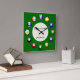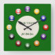 This popular wall clock features a set of coloured numbered pool balls, marking the time from 1 to 12 around the circumference of the clock on a green bed. There's an inner circle of beige with text placeholders above and below the centre that you can personalise with a name or your business marketing message.