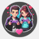 A romantic gaming couple holding controllers, surrounded by pixel hearts and neon lights. This design blends love and gaming culture, perfect for Valentine’s Day T-shirts and stickers made for true gamer couples.