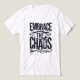 The image is a graphic design with a motivational message. The words "EMBRACE" and "CHAOS" are prominently displayed in large, bold, distressed black lettering, stacked vertically. The word "THE" is positioned in a smaller, stylized black font between "EMBRACE" and "CHAOS," and is flanked by decorative, swirling black lines or flourishes.