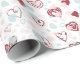 The design is a playful and romantic pattern featuring various heart shapes in red, pink, and light blue. The hearts are drawn in different styles, such as outlines, filled shapes, polka dots, stripes, and hand-drawn swirls, giving it a dynamic and lively appearance. The word "love" is scattered throughout the design in a casual handwritten style, adding to the theme of affection and joy.