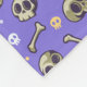 This pattern is a playful dance of quirky skulls and bones, scattered across a vibrant purple background. The cartoonish skulls with big, hollow eyes give off a mischievous yet friendly vibe, while the scattered bones add a sense of lively chaos. Pops of colour from the small, circular dots in white, yellow, and orange give the design an extra dash of fun and whimsy.