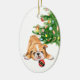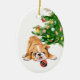 On the front of this Christmas ornament is an image of an adorable brown and white Bulldog pup. The puppy has found a Holiday tree bulb that looks like a Santa Claus suit, and is ready to play. The Christmas tree is in the background. The back of the ornament has your custom text contained in several easy to change text fields.