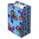 Purple and pink modern design featuring playful butterflies on a blue background.